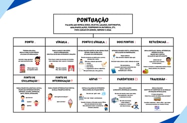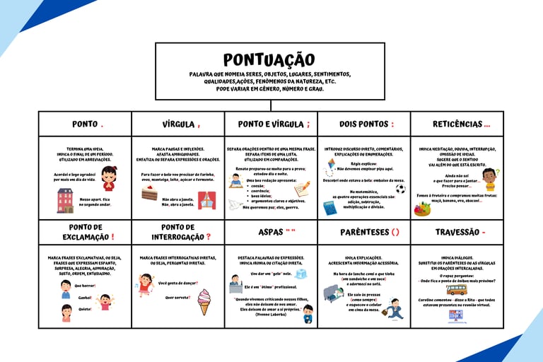 PONTUAÇÃO: Ponto, Vírgula, Ponto e Vírgula, Dois Pontos, Reticências, Ponto de Exclamação, Ponto de Interrogação, Aspas, Parênteses e Travessão.