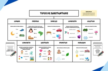 TIPOS DE SUBSTANTIVOS: Comum, Próprio, Simples, Composto, Coletivo, Concreto, Abstrato, Primitivo e Derivado.