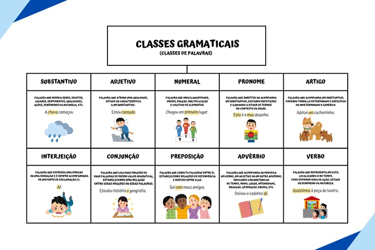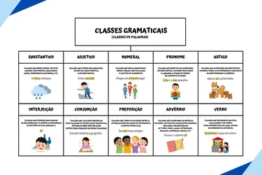 CLASSES GRAMATICAIS: Substantivo, Adjetivo, Numeral, Pronome, Artigo, Interjeição, Conjunção, Preposição, Advérbio e Verbo.