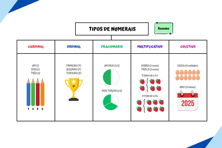TIPOS DE NUMERAIS: Cardinal, Ordinal, Fracionário, Multiplicativo e Coletivo.